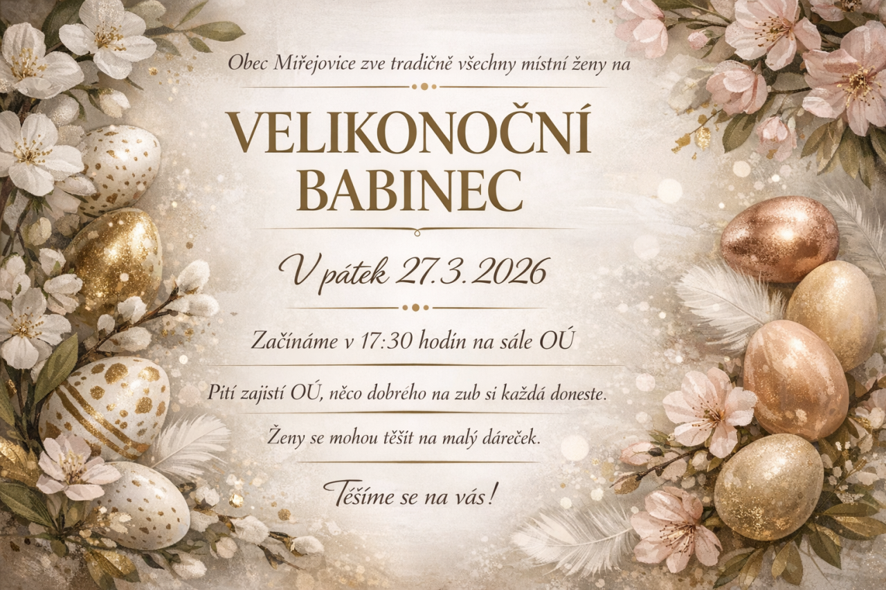 Srdečně zveme všechny místní ženy na tradiční velikonoční babinec, který se uskuteční v pátek 27.3.2026 od 17:30 hodin na sále OÚ. Pití je zajištěno, drobné občerstvení si přineste s sebou. Těšit se můžete i na malý dáreček.
